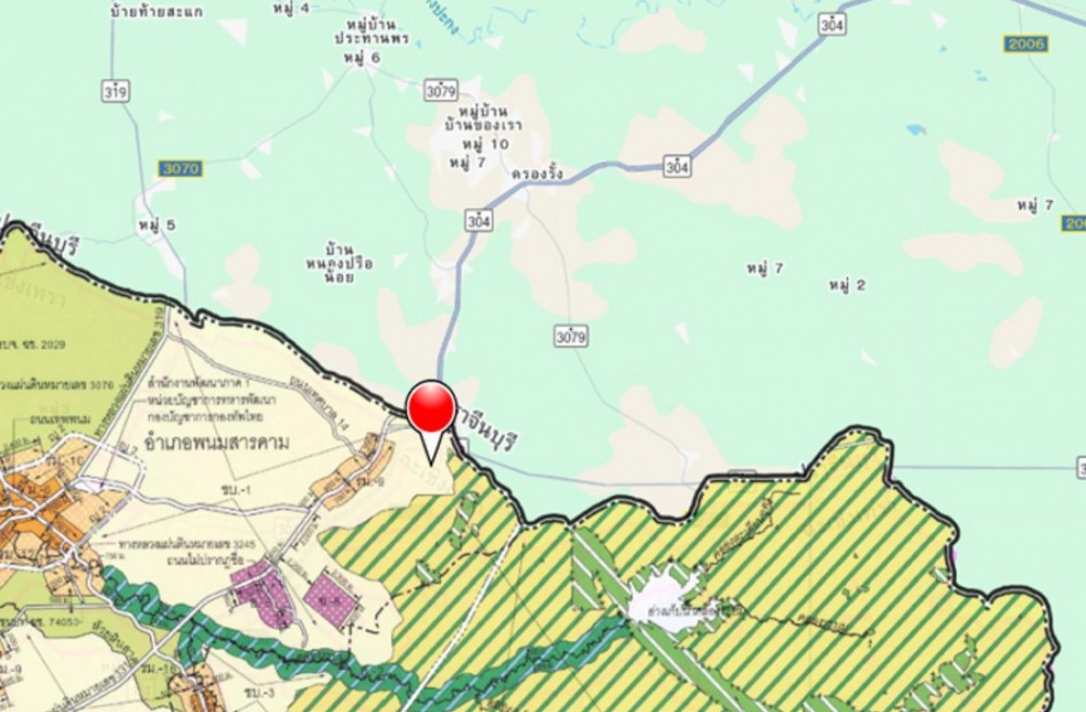 ที่ดินตั้งอยู่ที่ ต.เขาหินซ้อน อ.พนมสารคาม จ.ฉะเชิงเทรา ผังเขตพัฒนาพิเศษภาคตะวันออก EEC ผังสีเหลือง ประเภทชุมชนชนบท สามารถก่อสร้างโรงงาน โกดังสินค้าได้