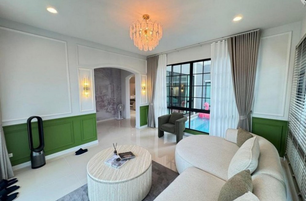พื้นที่ใช้สอย 500 ตารางเมตร จำนวน 2 ชั้น 6 ห้องนอน 7 ห้องน้ำ 2 ห้องเปล่า จอดรถ 4+2 คัน