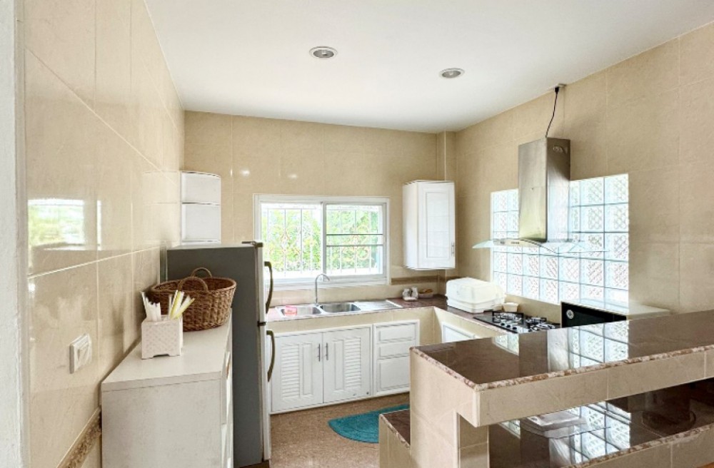 เฟอร์นิเจอร์ทั้งหมดในภาพ อาทิ เคาน์เตอร์ครัว, เตาแก๊ส 3 หัว, เครื่องดูดควัน, เตียงและฟูกที่นอน,