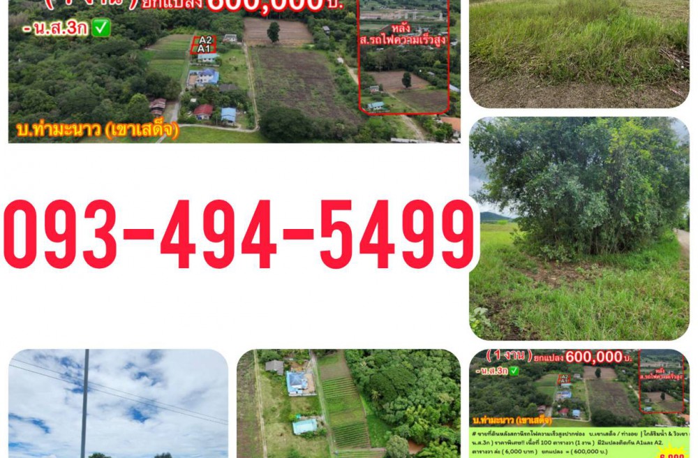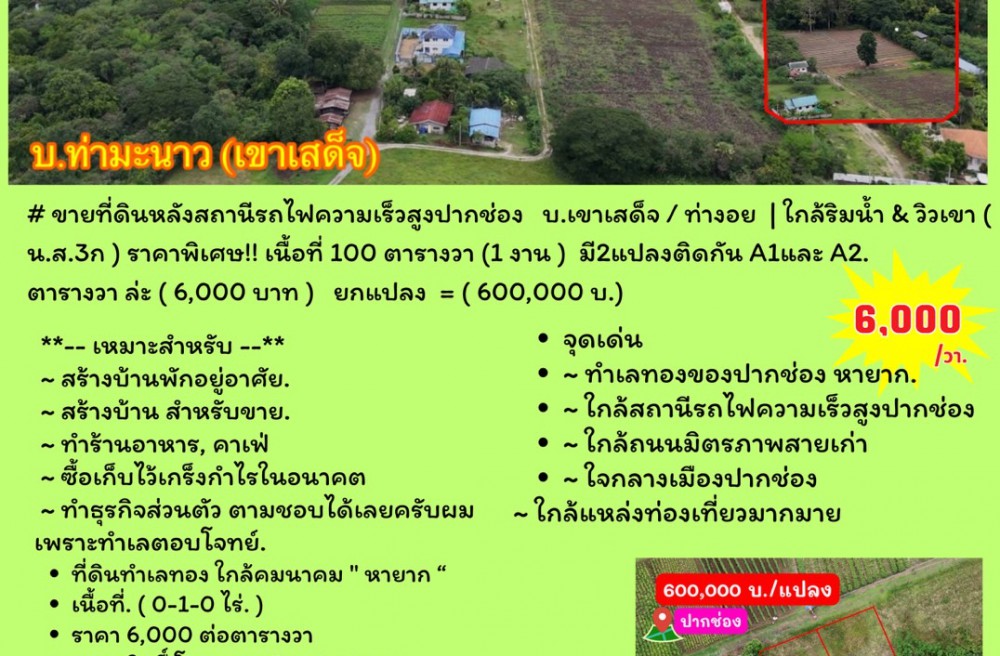 ปากช่อง , จังหวัดนครราชสีมาขายที่ดินหลังสถานีรถไฟความเร็วสูงปากช่อง บ.เขาเสด็จ / ท่างอย | ใกล้ริมน้ำ & วิวเขา ( น.ส.3ก ) ราคาพิเศษ!!