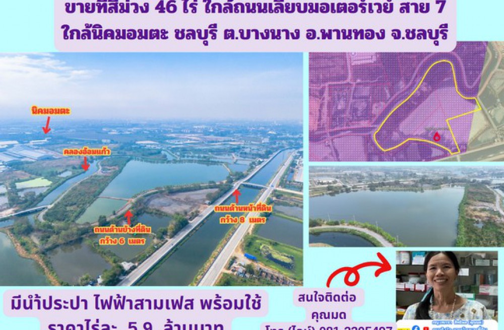 ขายที่สีม่วง 46 ไร่ ใกล้ถนนเลียบมอเตอร์เวย์ สาย 7 ใกล้นิคมอมตะ ชลบุรี ต.บางนาง อ.พานทอง จ.ชลบุรี