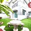 โต๊ะรับประทานอาหาร โซฟา ตู้เย็น 1 เครื่อง รอบบ้านจัดสวนและปูหญ้าเทียม เหล็กดัดมุ้งลวดทั้งหลัง