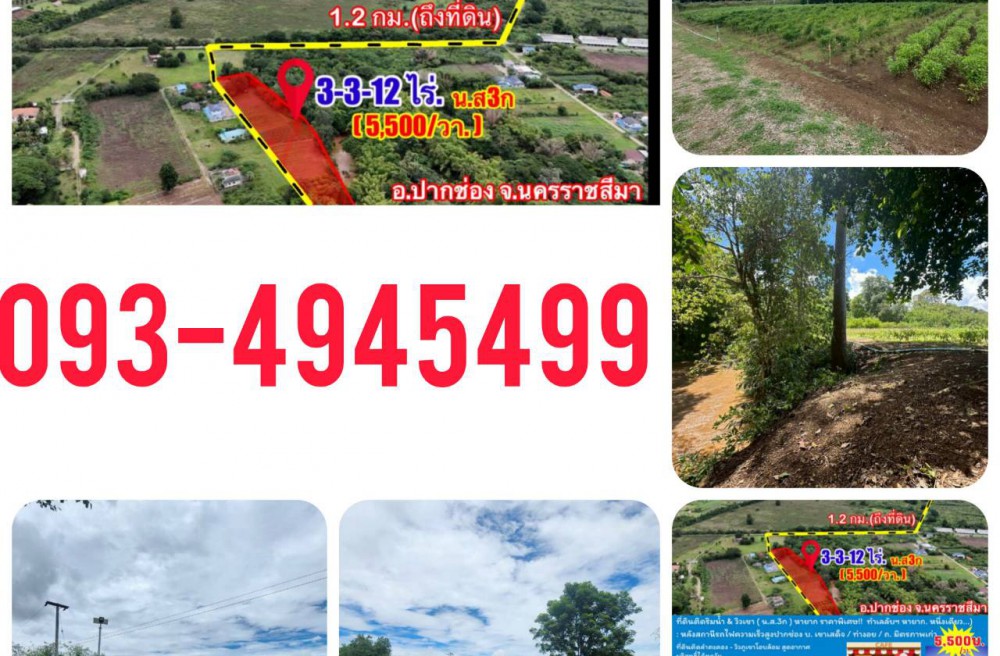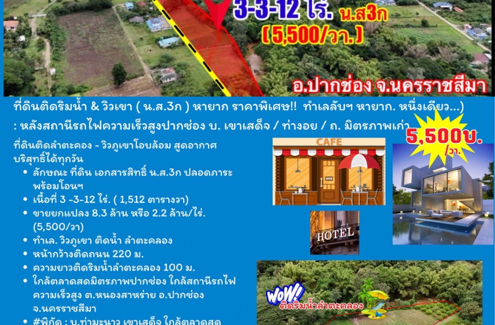 ปากช่อง , จังหวัดนครราชสีมาที่ดินติดริมน้ำวิวเขาปากช่อง.( 3-3-12 ไร่.)( 5,500 บ./ตร.วา ) | ( น.ส.3ก ) หายาก ราคาพิเศษ!!