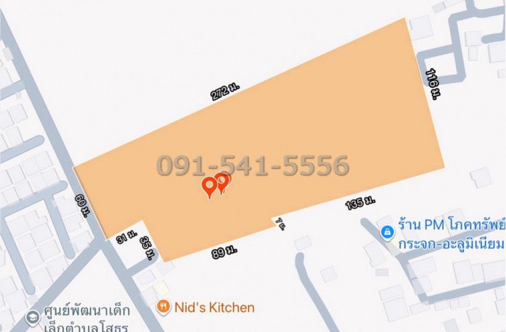 หน้ากว้างที่ดินติดริมถนนประมาณ 60 เมตร ส่วนที่ลึกสุดประมาณ 272 เมตร (ตามรูป)