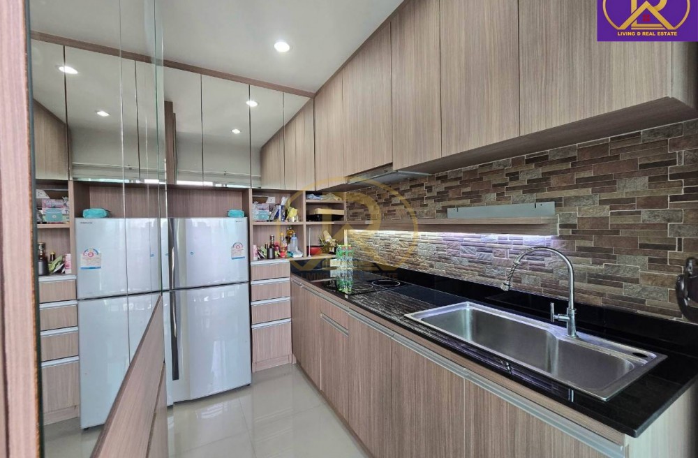 ห้องครัว : บิ้วอินสวยหรู พร้อมฟังชั่นการใช้งานที่สะดวกสบาย มีประตูพับกั้นระหว่างห้องครัว และห้องนั่งเล่นป้องกันกลิ่น