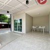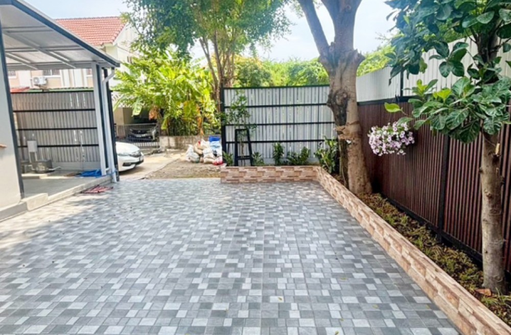 พื้นที่จอดรถหน้าบ้าน ปูกระเบื้องเรียบร้อย จอดได้ถึง 4 คัน