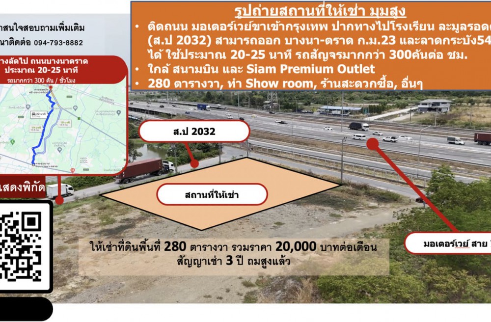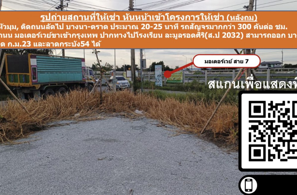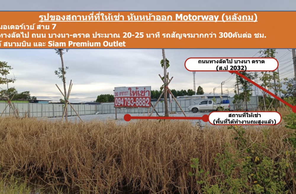 แปลงนี้ติดถนน มอเตอร์เวย์ขาเข้ากรุงเทพ ปากทางไปโรงเรียน ละมูลรอดศิริ(ส.ป 2032) สามารถออก บางนา-ตราด ก.ม.23 และลาดกระบัง 54 ได้