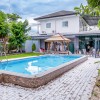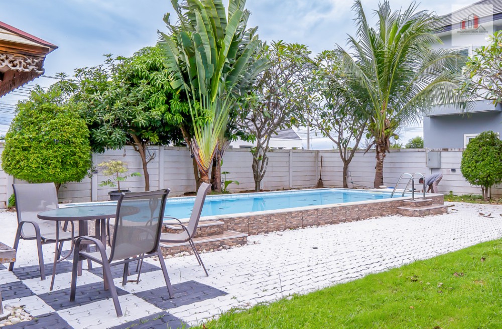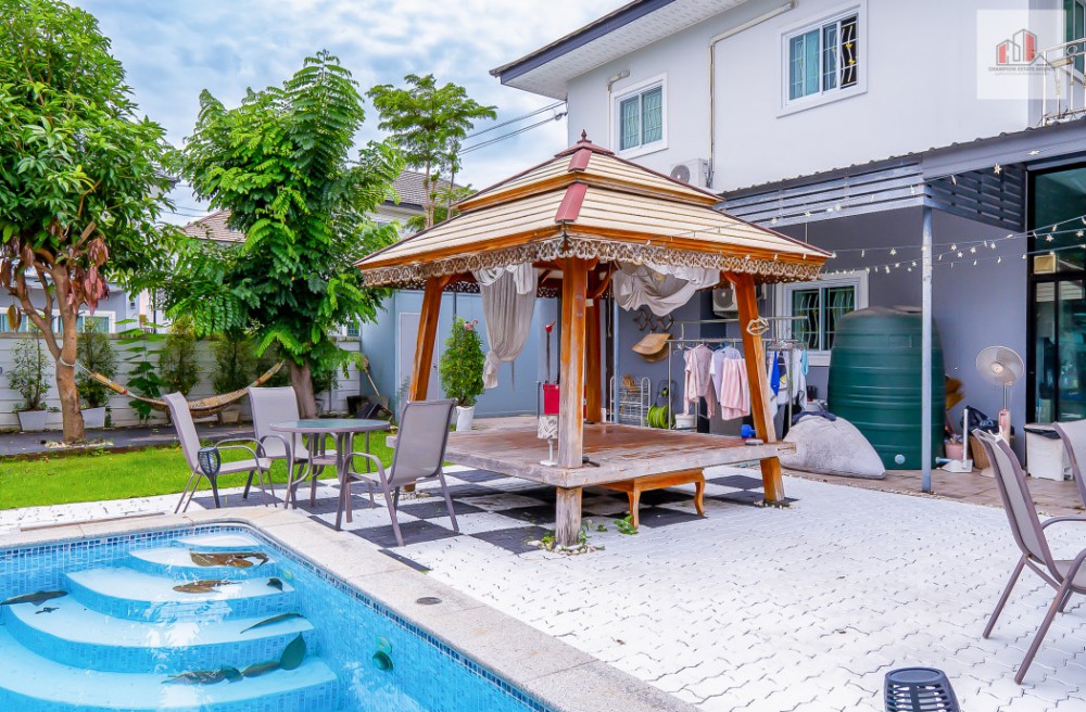 ด้านหลังบ้านมีสระว่ายน้ำ และศาลาพักผ่อน บรรยากาศดีมาก