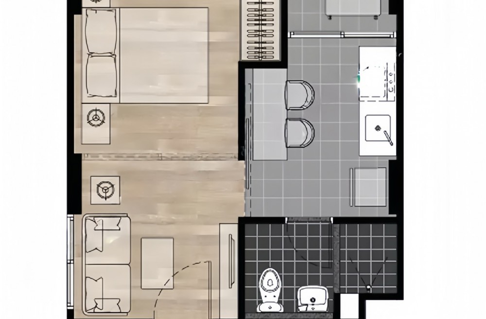 ∙ 1 ห้องนอน (มีกระจกกั้น) , 1 ห้องน้ำ , 1 ห้องครัว (มีกระจกกั้น)