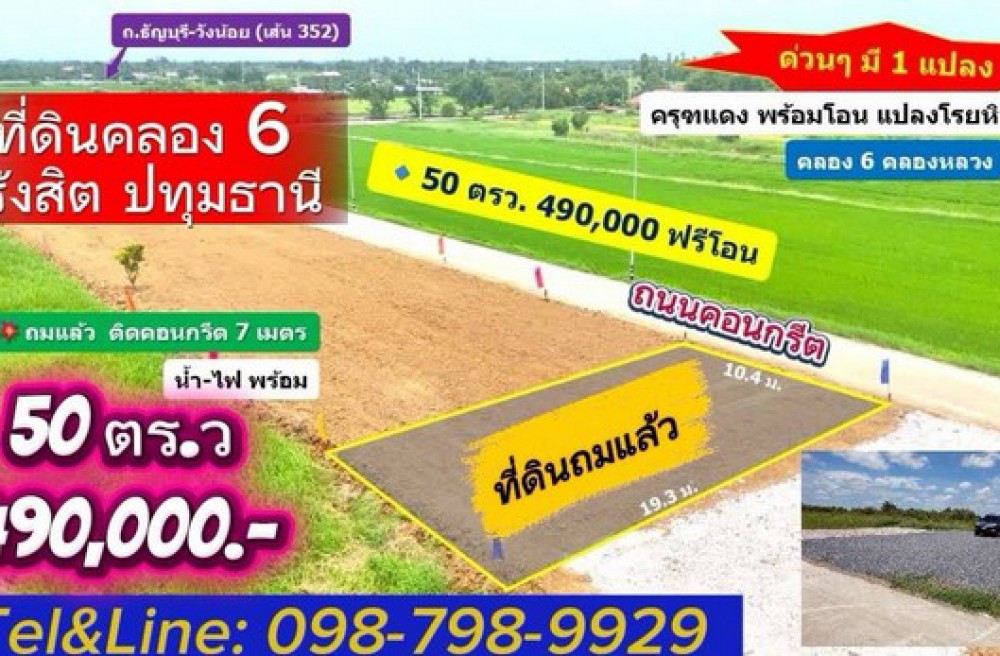 คลองหลวง , จังหวัดปทุมธานีด่วนๆ มี 1 แปลง 50 ตรว. 490,000 ฟรีโอน