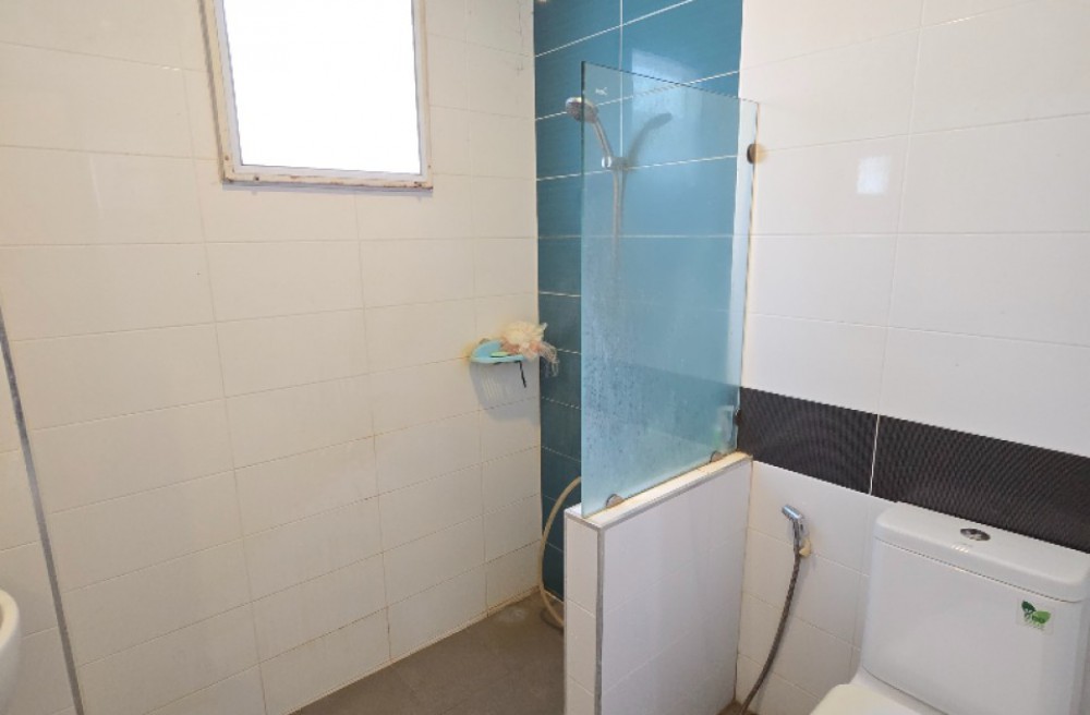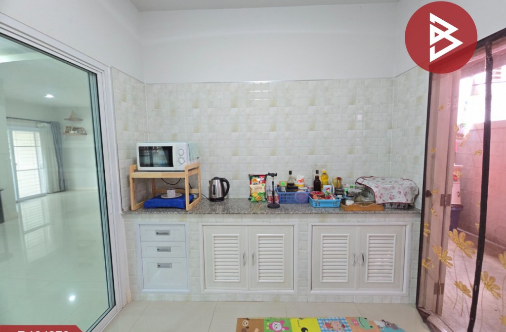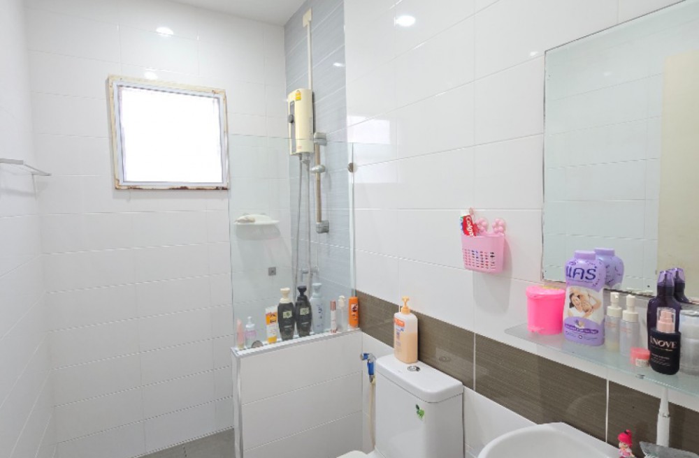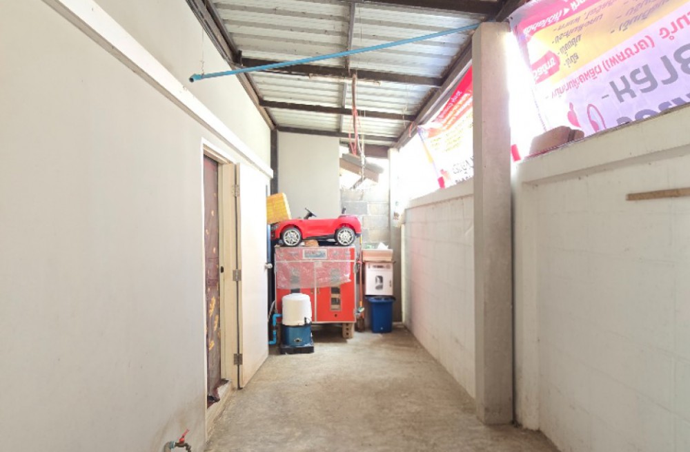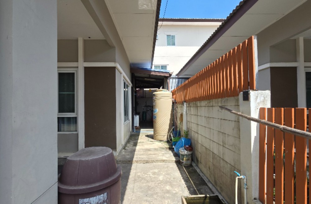 ด้านหลังต่อเติมห้องครัวไทย และมีโรงเก็บของอยู่หลังบ้าน ส่วน ด้านหน้าบ้านต่อเติมโรงจอดรถ พร้อมปูกระเบื้อง