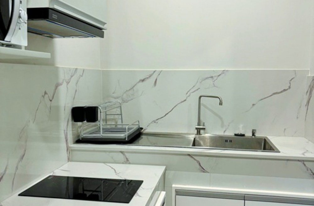 - ห้องครัวพร้อมอุปกรณ์ครบครันพร้อมเคาน์เตอร์หินอ่อน เตาประกอบอาหาร ไมโครเวฟ และบาร์อาหารเช้า