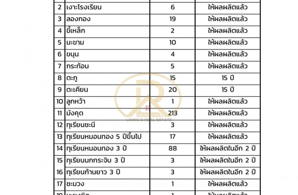 • พื้นที่ที่ดินเป็นสวนผสม มีผลไม้เต็มพื้นที่ พร้อมให้ผลผลิต มังคุด ทุเรียน และอื่นๆ(ตามรายการที่แสดงในเอกสารแนบ)
