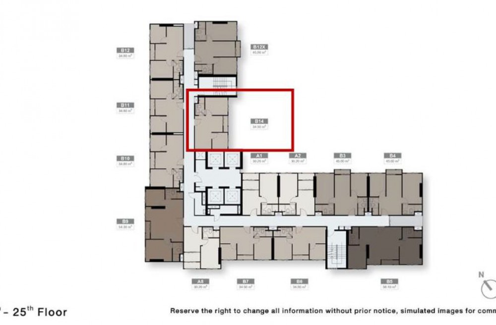 แปลน B14 เนื้อที่ 34.50 ตร.ม. ชั้น 24 หันหน้าเข้าตึก Pearl วิวไม่บล็อค ห้อง 1 bedroom plus หันหน้าทิศตะวันออกเฉียงใต้