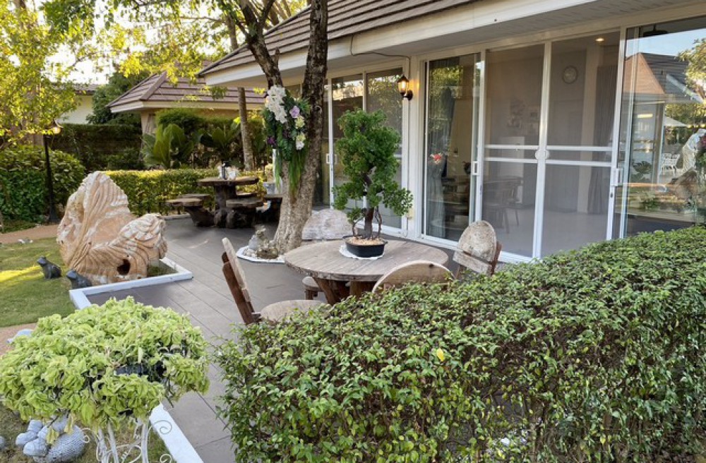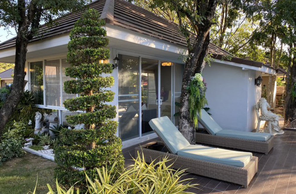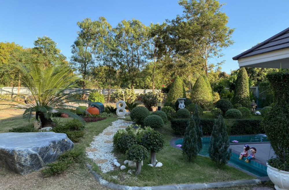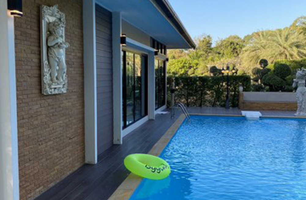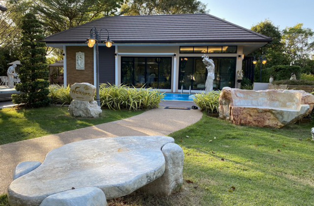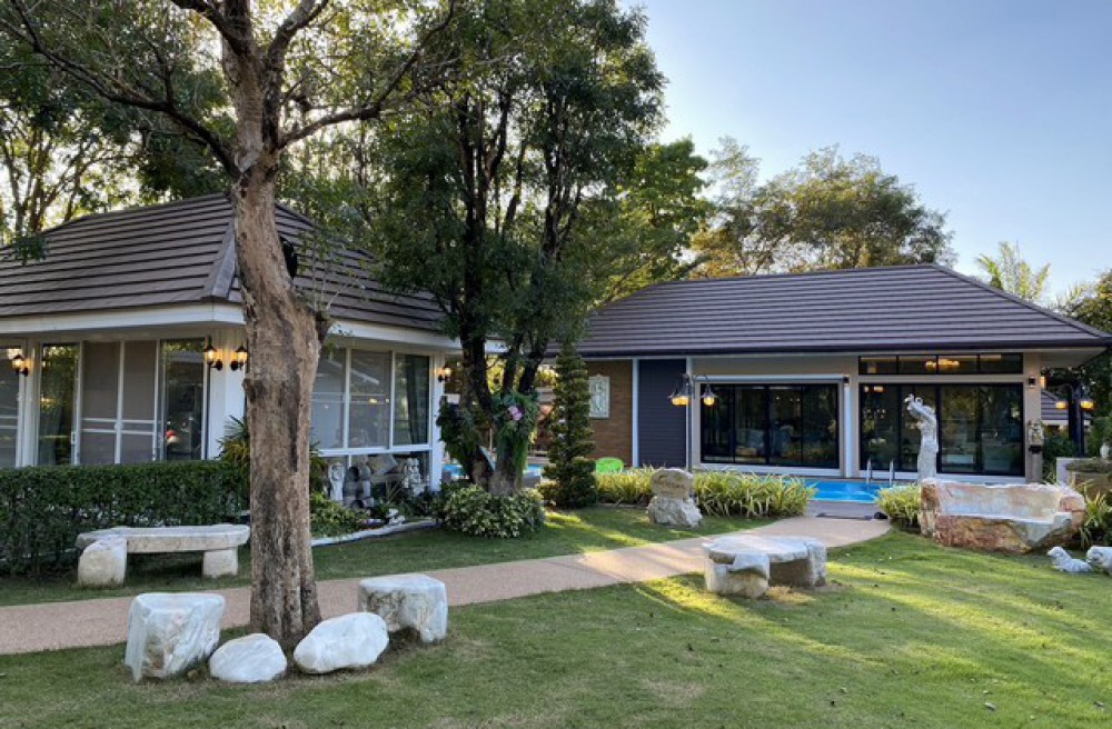 บ้าน 3 หลังมีห้องน้ำทุกหลังและมีห้องอาบน้ำข้างสระว่ายน้ำและห้องน้ำคนสวนและมีศาลาอยู่ข้างบ้านขนาด4คูณ8เมตร