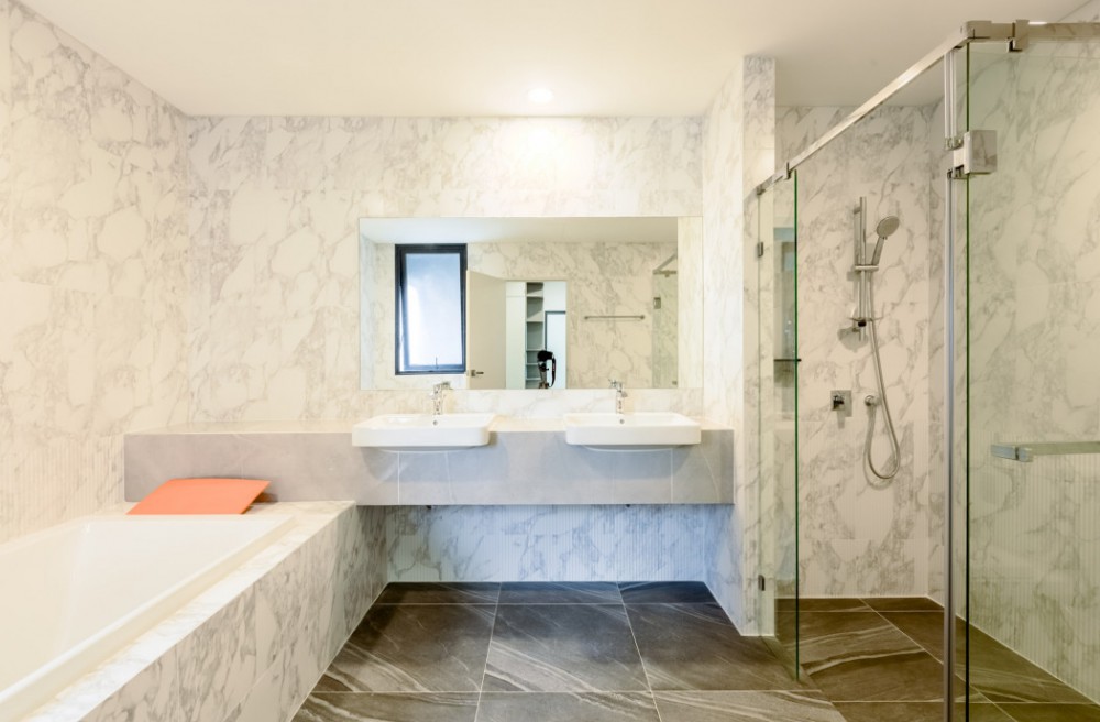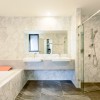 - ห้องน้ำหินอ่อน พร้อมอ่างอาบน้ำและฝักบัวเรนชาวเวอร์