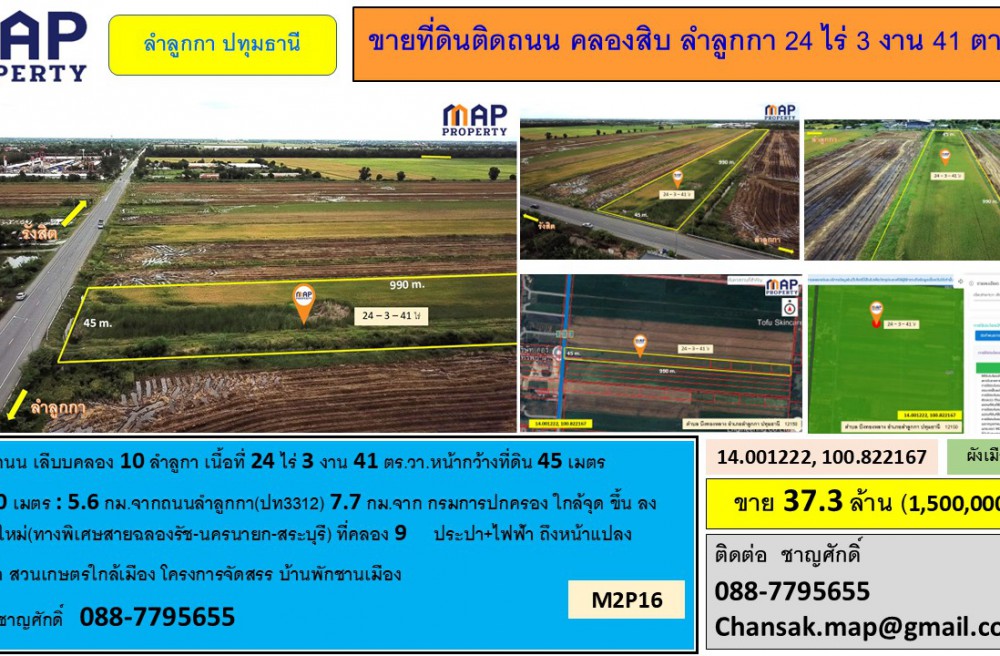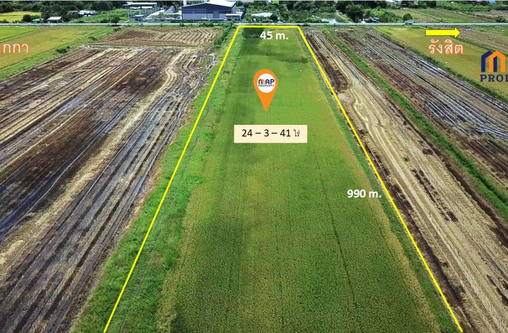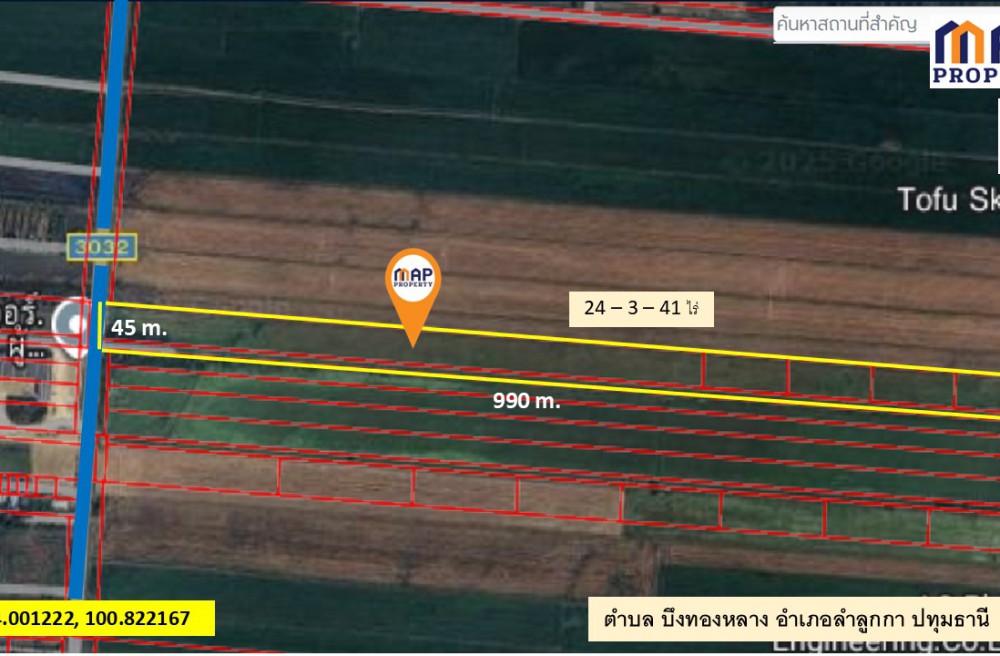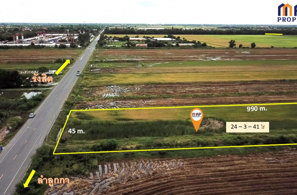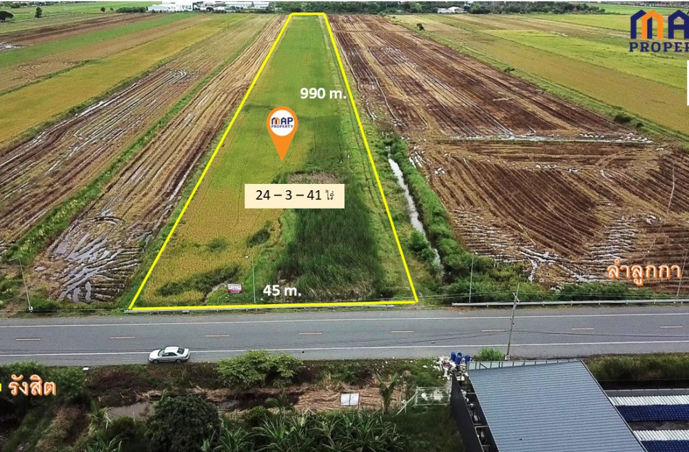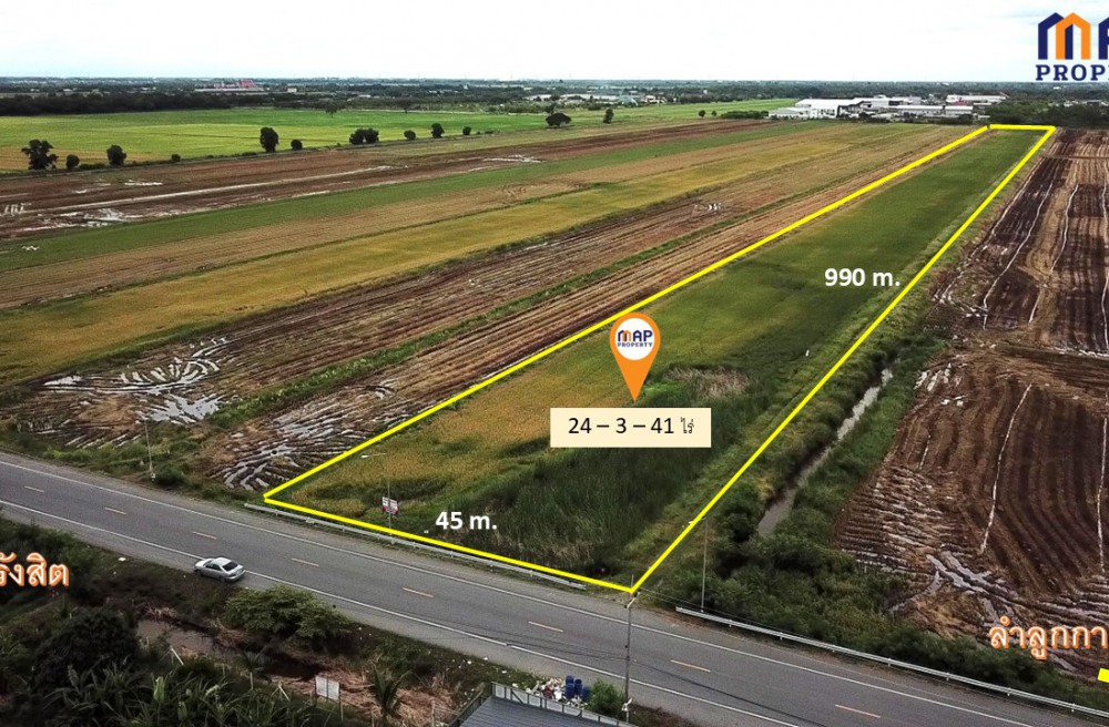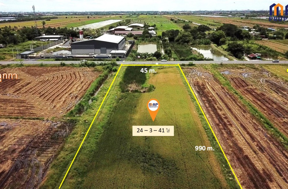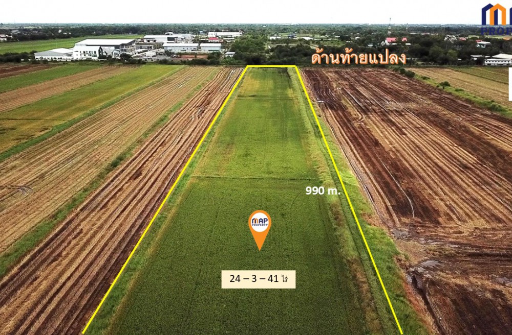 -เนื้อที่ 24 ไร่ 3 งาน 41 ตร.วา. หน้ากว้างที่ดินยาว 990 เมตร