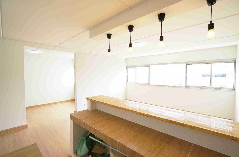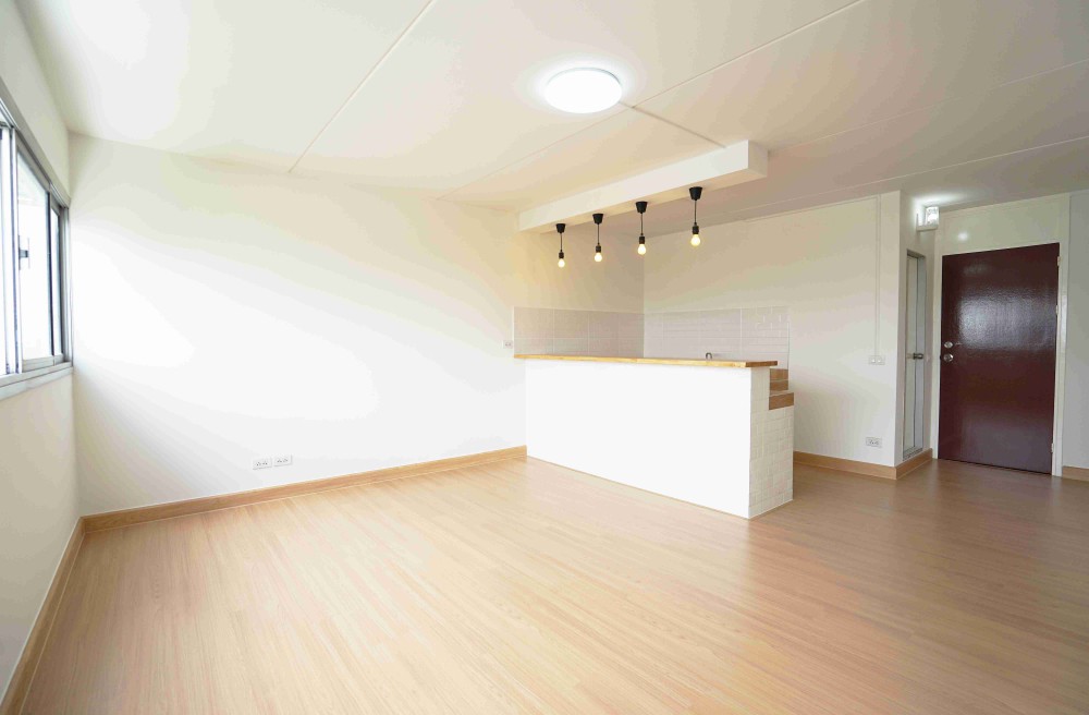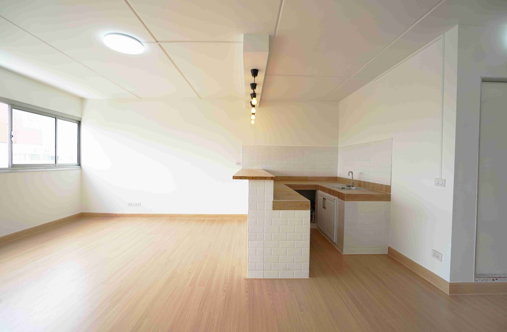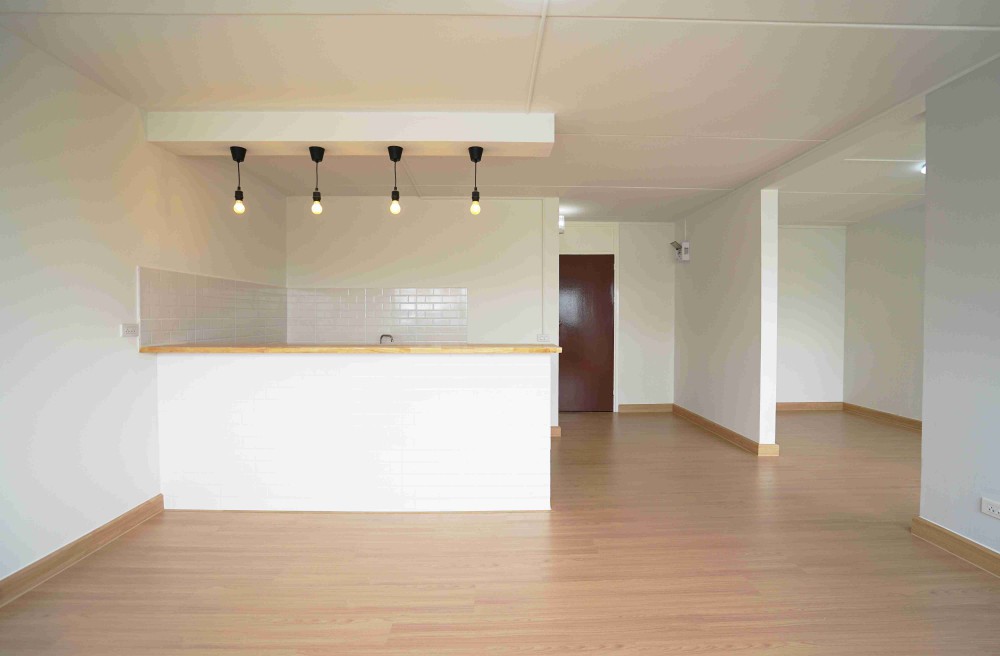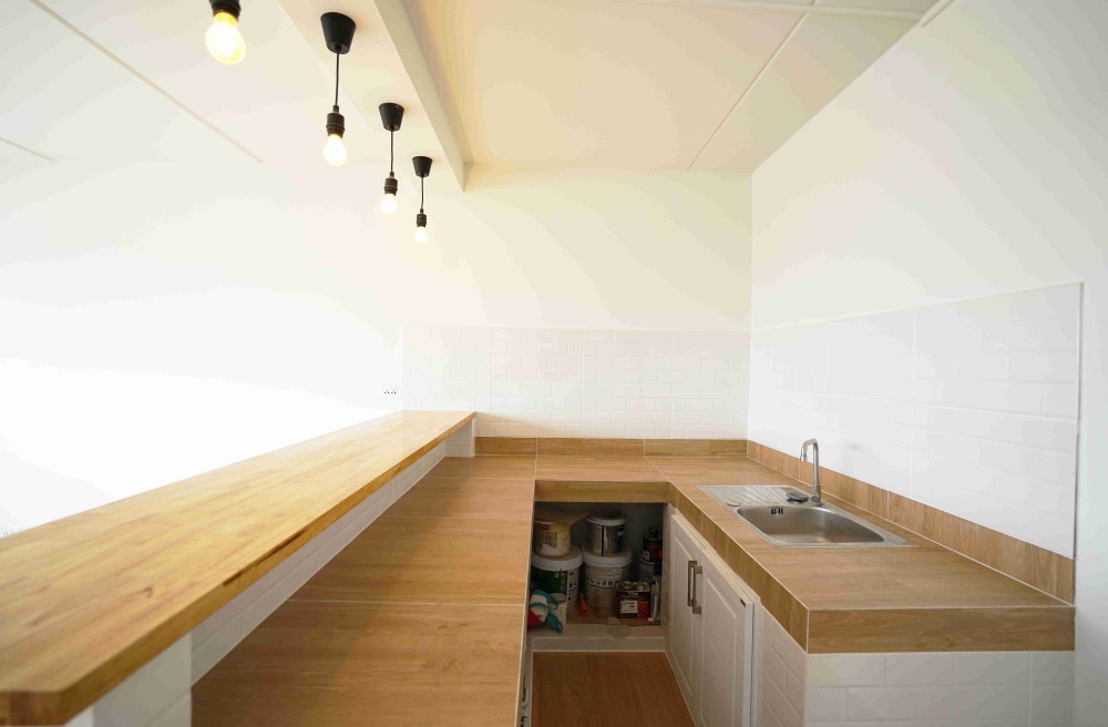 ภายในห้อง ตกแต่งพื้นด้วยลามิเนต โดยเลือกเป็นสีไม้เพื่อให้ความรู้สึกอบอุ่นและเพิ่มความมินิมอล แบ่งห้องนอนออกเป็นสัดส่วน ห้องน้ำตกแต่งปูกระเบื้องใหม่สวยงาม และ Built-in เค้าเตอร์ห้องครัวขนาดพอเหมาะพร้อมใช้งาน