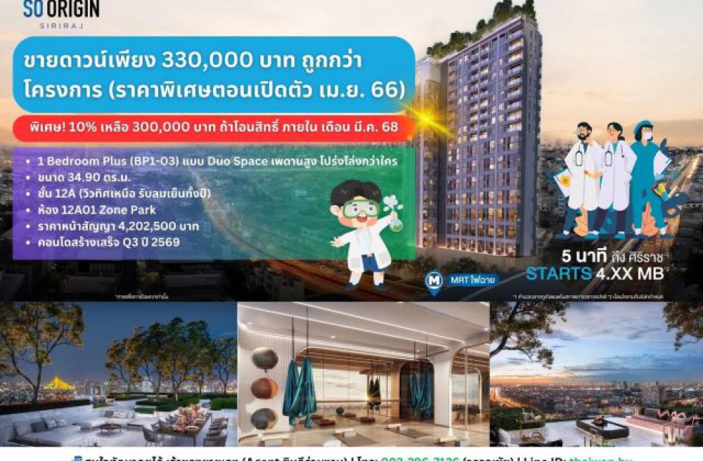 ขายดาวน์คอนโด SO Origin Siriraj ห้อง Duo Space เพดานสูง ห้องสวย ราคาดี ติด MRT แยกไฟฉาย เดินแค่ 80 เมตร