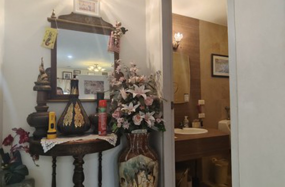 -ชั้นล่าง พื้นปูด้วยกระเบื้อง แบ่งแยกสัดส่วน มี 1 ห้องนั่งเล่นและรับแขก 2 ห้องครัว ครัวนอกและครัวใน 1 ห้องเก็บของ 1 ห้องแม่บ้าน ติดตั้งมุ้งลวด เหล็กดัด ผ้าม่าน แทงค์น้ำ เครื่องกรองน้ำ ปั้มน้ำ แอร์ เครื่องทำน้ำอุ่น