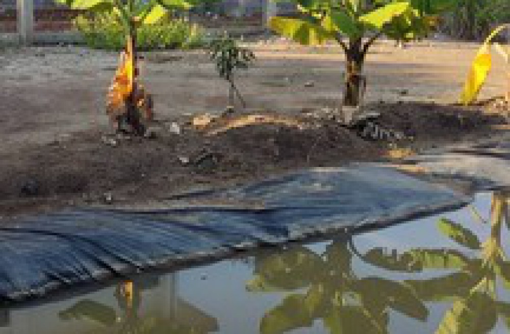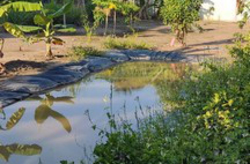 ภายในแปลงมีบ่อเก็บน้ำขนาด 2×5 ม. ลึก 60 ซม. และปลูกผักผลไม้หลากหลาย เช่น
