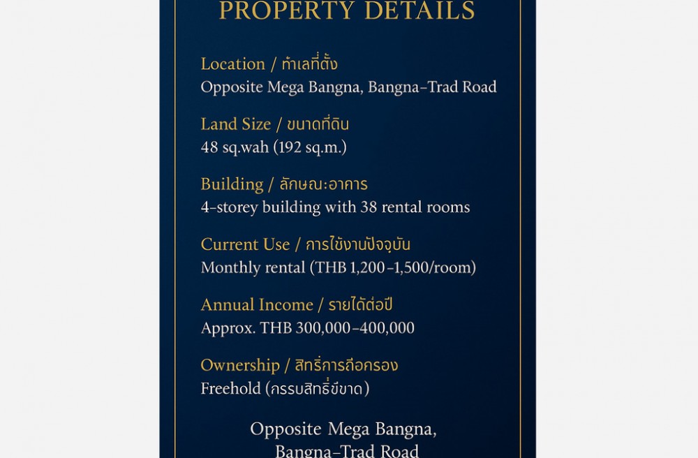 บางพลี , จังหวัดสมุทรปราการตึก 4 ชั้น + Rooftop , 38 ห้อง บนที่ดิน 48 ตารางวา ติดถนนบางนา-ตราด กม.8