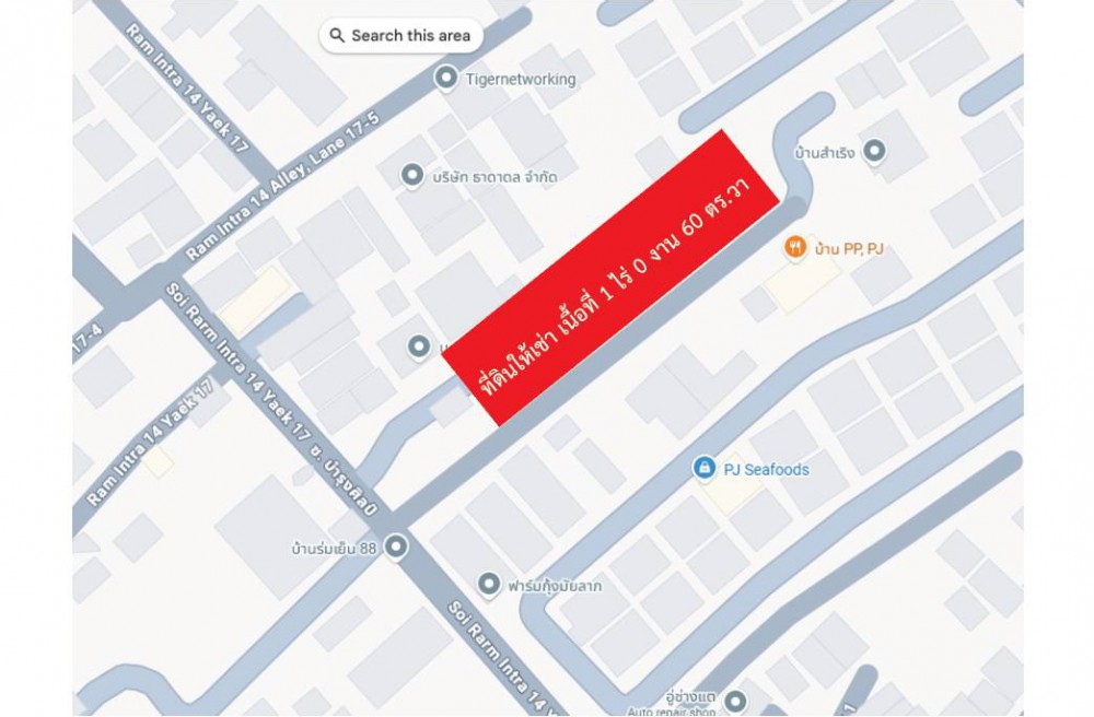 ต้องการให้เช่าที่ดินเปล่าถมแล้วราคาถูก มีเนื้อที่ให้เช่า 1 ไร่ 0 งาน 60 ตารางวา หรือ 460 ตารางวา ที่ดินที่ให้เช่าเข้าทางถนนรามอินทราซอย 14 ประมาณ 1 ก.ม. เลี้ยวซ้ายเข้าซอยรามอินทราซอย 14 แยก 17 ประมาณ 300 เมตร ถ้าเข้าทางถนนเกษตรตัดใหม่ หรือ ถนนประเสริฐมนูกิจซอย 29 ข้ามสะพานข้ามคลองโคกคราม ซอยรามอินทรา 14 แยก 17 อยู่ทางด้านขวามือ ถนนรามอินทรา 14 แยก 17 เป็นเส้นทางลัดไปออกถนนรามอินทราซอย 34 และ ขึ้นทางด่วนเอกมัย-รามอินทราได้ ที่ดินที่ให้เช่าเป็นรูปสี่เหลี่ยมผื้นผ้ากว้างประมาณ 80 เมตร ลึกประมาณ 24 เมตร ที่ดินที่ให้เช่าล้อมรั้วคอนกรีตไว้ทั้งหมดแล้ว ให้เช่าทั้งหมดในราคา 30,000 บาท/เดือน