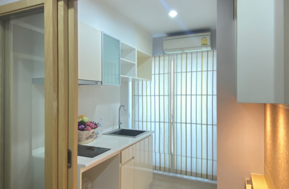 > ห้องครัว อุปกรณ์ฺครบ มีเตาไฟฟ้า โต๊ะทานข้าว ตู้เก็บของต่างๆ ผ้าม่าน 2 ชั้น