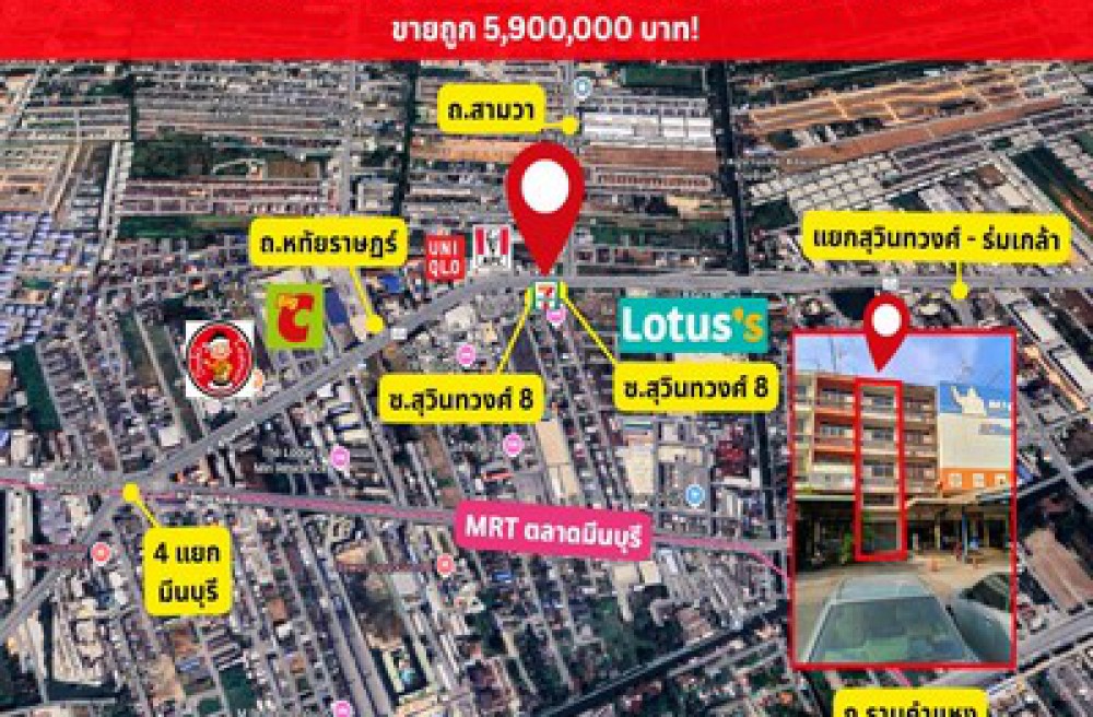 ขายอาคารพาณิชย์ติดถนนสุวินทวงศ์ (หน้าปากซอย เข้าถนนสามวา) ใกล้ 4 แยกมีนบุรี