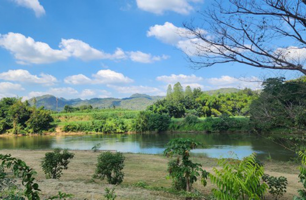 ขายที่ดินติดแม่น้ำแควน้อย เมืองกาญจนบุรี 17 ไร่ พร้อมบ้านริมน้ำสวยๆ พร้อมปลูกต้นทุเรียน และผลไม้อื่นๆ ไว้แล้ว ใกล้แหล่งชุมชน เหมาะซื้อเก็บไว้อยู่อาศัย