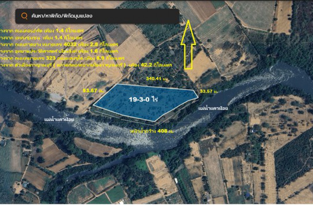ขายที่ดินติดแม่น้ำแควน้อย ไทรโยค กาญจนบุรี 19 ไร่ หน้าน้ำกว้างมาก 400 ม.เลย ใกล้ อุทยานประวัติศาสตร์ เมืองสิงห์ ใกล้ทางไปอุทยานแห่งชาติไทรโยค-เอราวัณ
