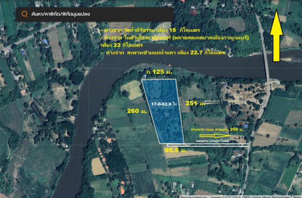 - ก 125 ม. (ส่วนที่ติดแม่น้ำแควน้อย) ก 9.5 ม. ( ส่วนติดถนนสาธารณประโยชน์ )