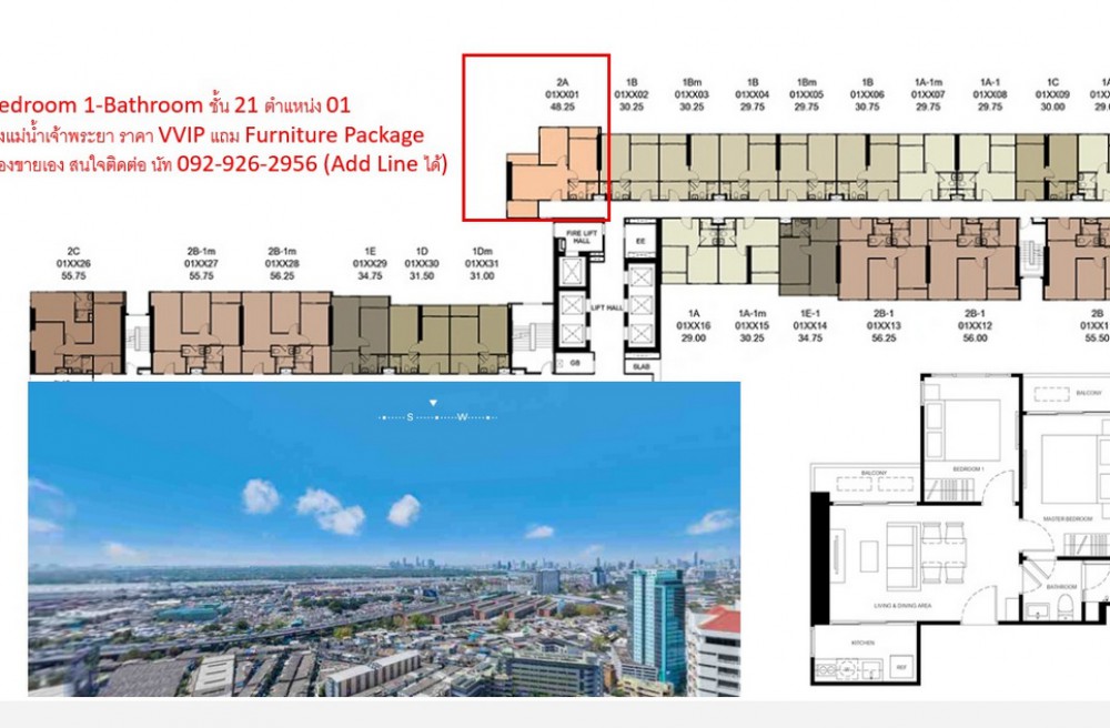 - ตำแหน่ง 01 เป็นห้องมุม ออกมานั่งที่ระเบียงเห็นวิวแม่น้ำเจ้าพระยาที่ทิศใต้ อยู่ในห้องนอนก็ได้วิวโค้งแม่น้ำเจ้าพระยาที่ทิศตะวันตก