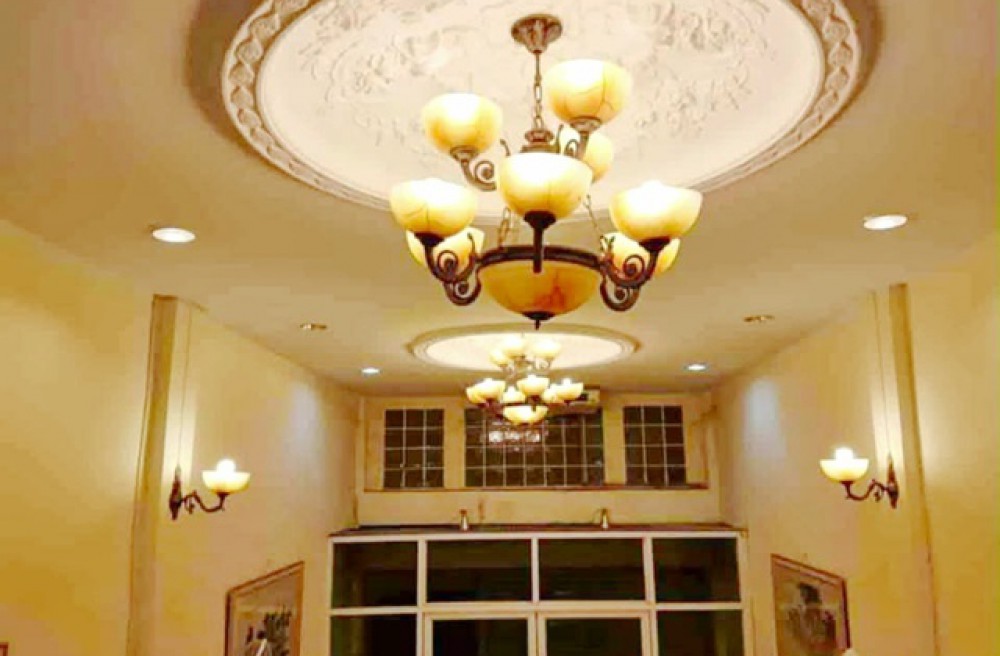 - บ้านตกแต่งสวย น่าอยู่ เพดานทำฝ้าหลุมพร้อมโคมไฟระย้า