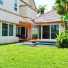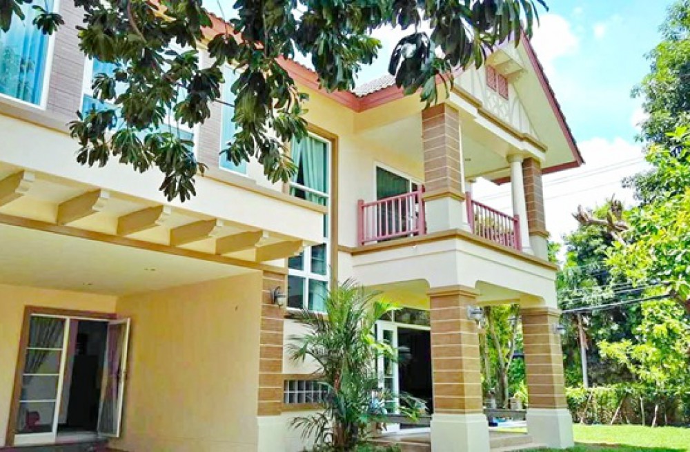 For rent 2-story detached house 121 sq.wa. on corner lot 5bed Robinson Ratchaphruek 2.4 km. 4 bath 310 sq.m. fully furnished. Pakkret 2 Hospital 2.6 km. Prime location next to main road and park. 48,999 B-M. Singapore International School Nonthaburi 3.0 km. Suitable for residential use. Chaiyaphruek Road.