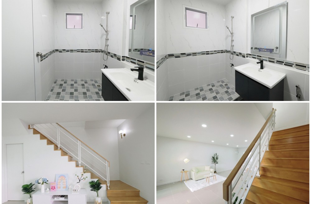 - ภายในบ้านชั้นล่างปูพื้นด้วยแกรนิตโต้อย่างดี ชั้นบนพื้นไม้ลามิเนท ห้องนอนใหญ่มีระเบียง ห้องโถงด้านล่างกว้าง ประตู-หน้าต่างอลูมิเนียมบานเลื่อนกระจกเขียวตัดแสง ห้องน้ำสไตล์โมเดิล ระบบไฟLED ห้องครัวขนาดใหญ่พร้อมเคาน์เตอร์ ลานจอดรถปูกระเบื้องเต็มพื้นที่ จอดรถในบ้านได้ 2 คัน