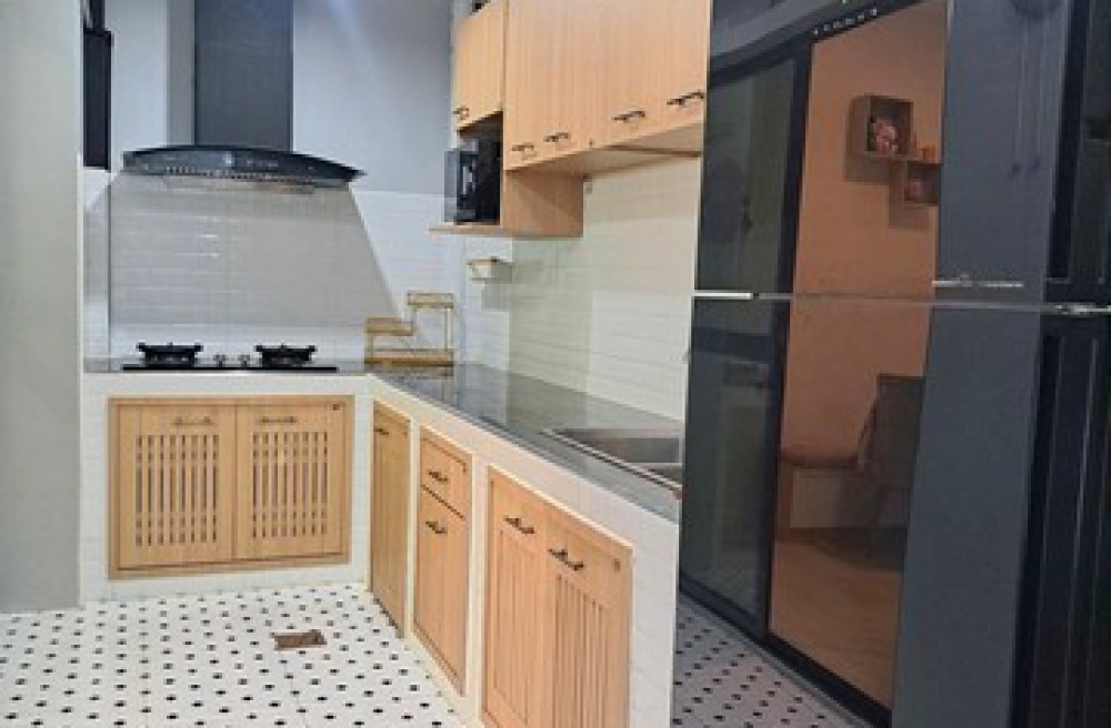 หลังบ้านต่อเติมหลังคาพร้อมบิ้วท์อินห้องครัวเรียบร้อย มีฮูดดูดอากาศ