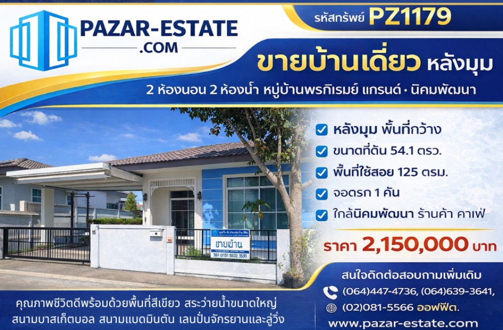 นิคมพัฒนา , จังหวัดระยองPZ1179 ขายบ้าน ชั้นเดียว 54.1 ตรว. หลังมุม
