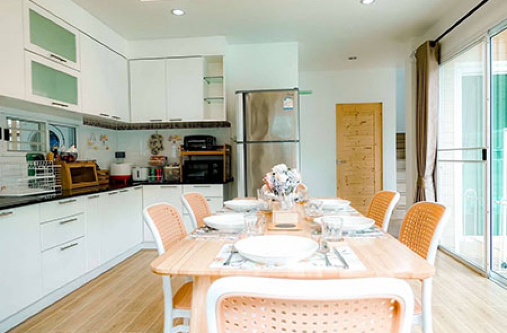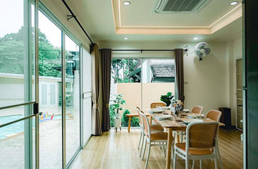 ห้องรับแขก ห้องรับประทานอาหาร ครัวฝรั่งในบ้าน ครัวไทยพร้อมเตาไฟฟ้า 2 หัวนอกบ้าน สระว่ายน้ำ (3*8 เมตร)