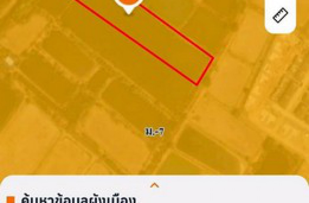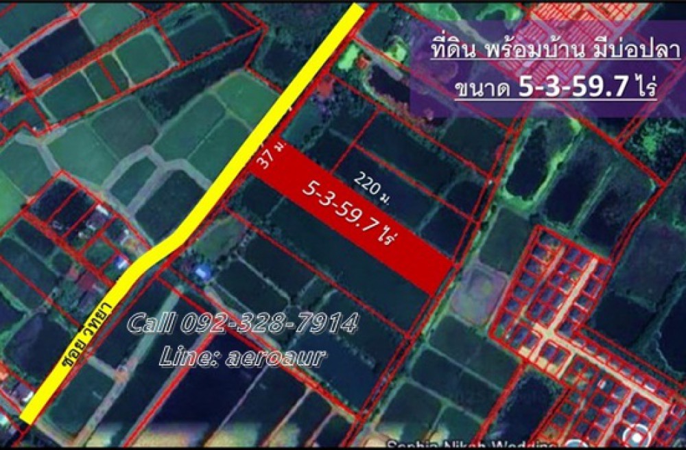 ขนาดที่ดิน: 5-3-59.7 ไร่ รูปทรงสี่เหลี่ยมผืนผ้า (กว้าง 37 เมตร x ลึก 220 เมตร)