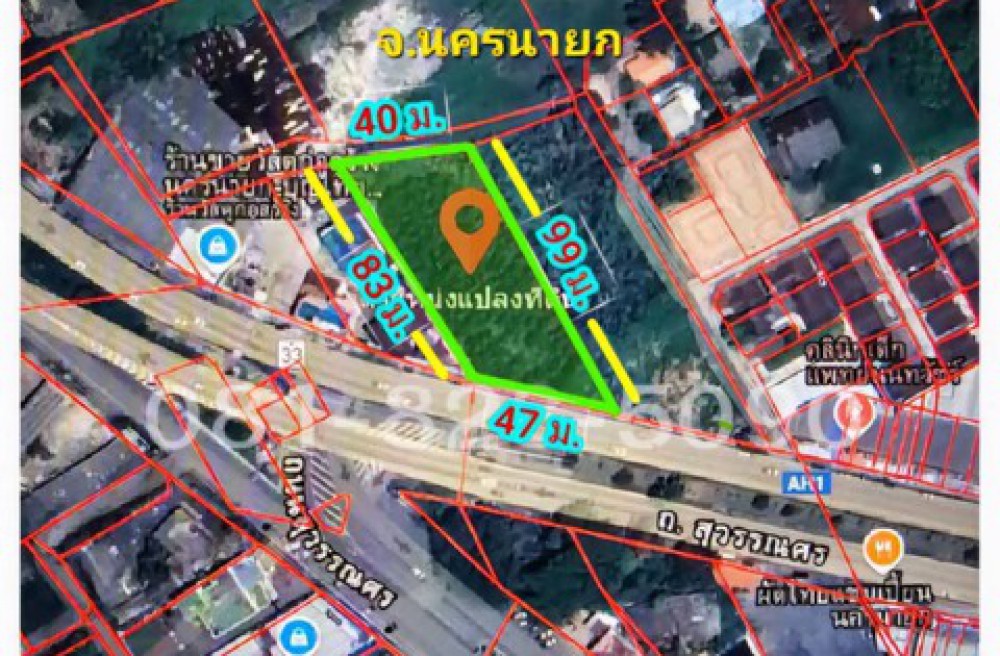 เมืองนครนายก , จังหวัดนครนายกขายที่ดินสวย ใกล้ รพ. นครนายก(1 กม.) ติดถนนสุวรรณศร (ทางหลวงแผ่นดินหมายเลข 33) อ.เมือง จ.นครนายก อยู่ในเขตชุม ผังสีแดง ขายต่ำกว่าราคาประเมิน
