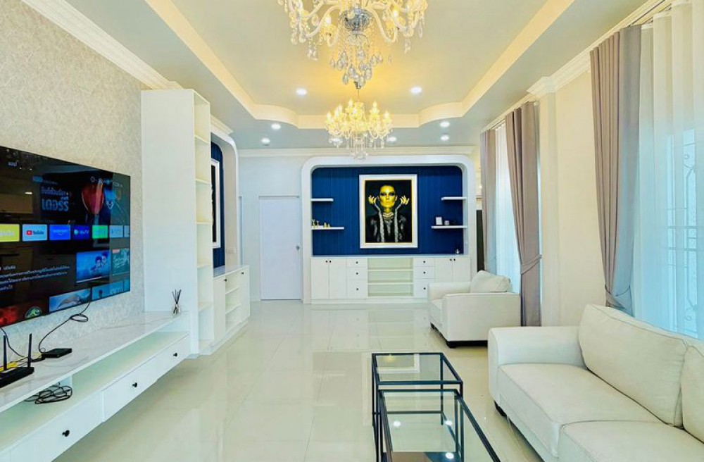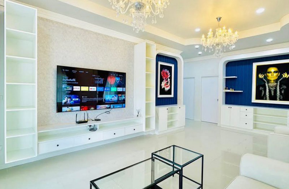 ห้องนั่งเล่น & ห้องครัว โซฟา Luxury 3 ที่นั่ง + Armchairs ชั้นวางทีวี Built-in ติดผนัง (ยาว 2.4 ม.) ทีวี Samsung 75 นิ้ว Island รับประทานอาหาร (1.8 ม.) ครัว Built-in พร้อมซิงค์ล้างจาน เตาไฟฟ้า + ฮูดดูดควัน ตู้เย็น Samsung 13.9 คิว
