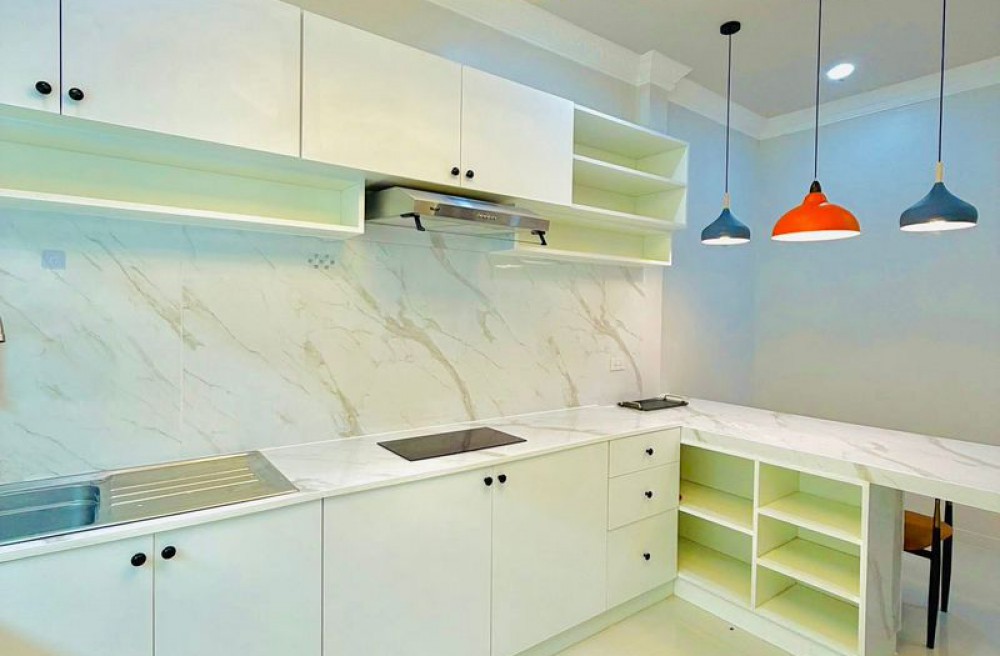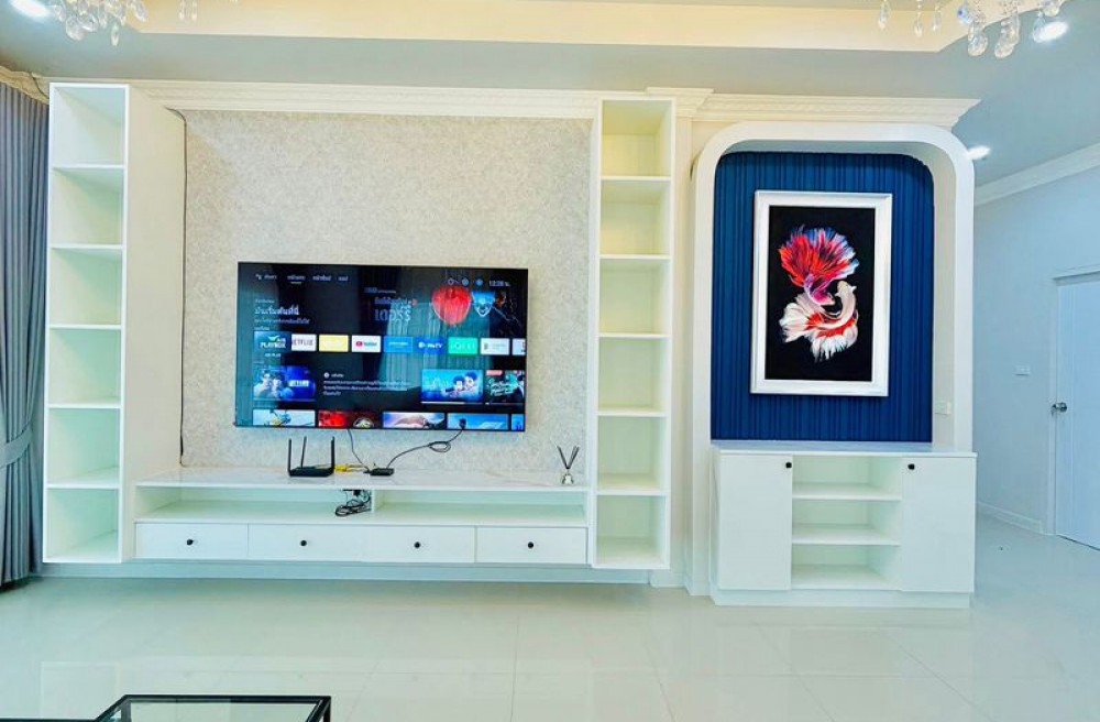 ห้องนอน 3 เตียง Built-in 6 ฟุต ตู้เสื้อผ้า + โต๊ะเครื่องแป้ง Built-in (1.2 ม.) ชั้นวางทีวี Built-in (2.0 ม.)
