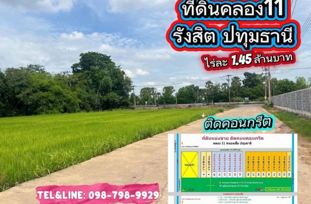 หนองเสือ , จังหวัดปทุมธานีที่ดินสวย ทำเลทอง ติดถนนคอนกรีต#ที่ดินคลอง11 รังสิต ปทุมธานี 1 ไร่ 1.45 ล้าน