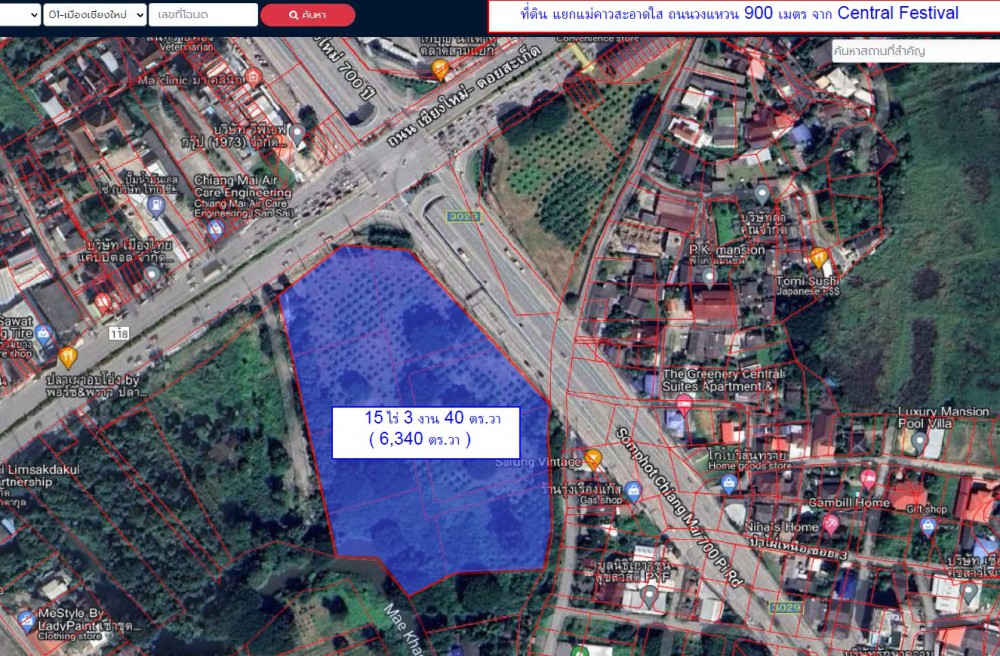ที่ตั้ง : ที่ดินแปลงหัวมุมสี่แยกแม่คาวสะอาดใส ถ.เชียงใหม่-ดอยสะเก็ด และ ถนนสมโภชเชียงใหม่ 700 ปี (วงแหวนรอบ2) (ทางหลวงหมายเลข 118 และ 132 ) จังหวัดเชียงใหม่