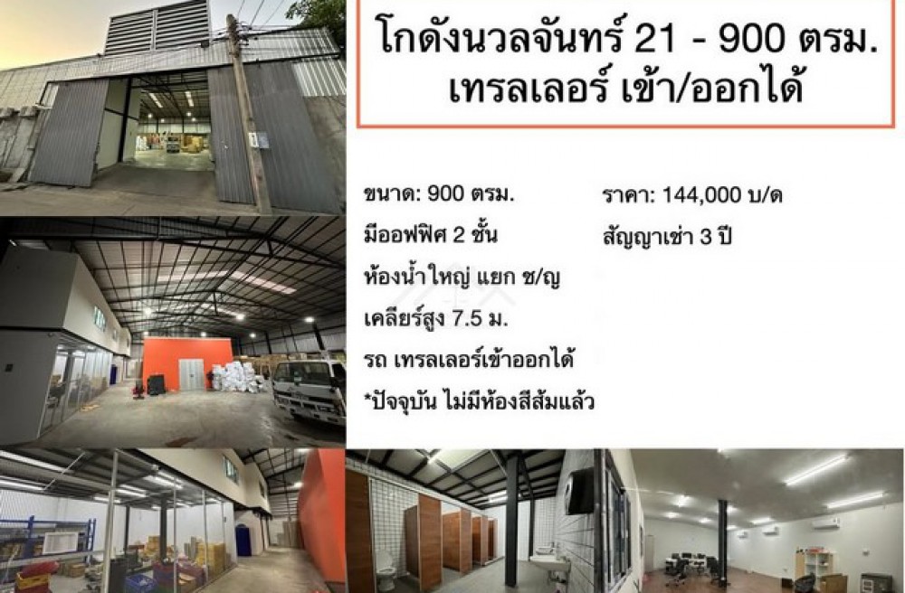 เขตบึงกุ่ม , จังหวัดกรุงเทพมหานครให้เช่าโกดัง 900 ตรม. พร้อมออฟฟิศ ซอยนวลจันทร์ 21 ห้องน้ำในตัว รถเทรลเลอร์เข้าออกได้ ใกล้เลียบด่วน ใกล้ BTS รามอินทรา ก.ม.6