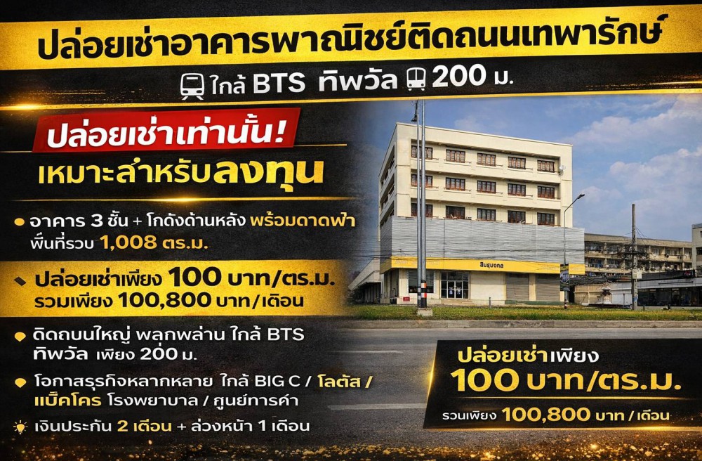ทำเลทอง ติดถนนเทพารักษ์ ถนนหลักสายธุรกิจ การจราจรคึกคัก มองเห็นอาคารชัดเจนจากระยะไกล ใกล้รถไฟฟ้าสายสีเหลือง สถานีทิพวัล เพียง 200 เมตร
