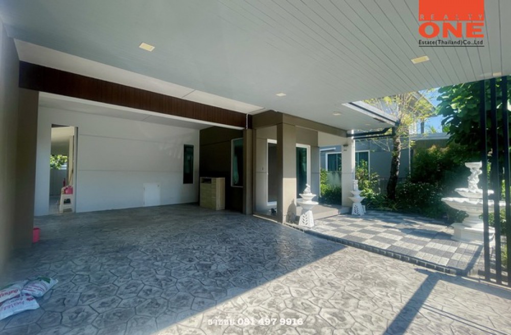 – ด้านหน้าบ้านจอดรถมีหลังคา 2 คัน พื้นโรงรถทำเป็นคอนกรีตสแตมป์โมเดิร์น