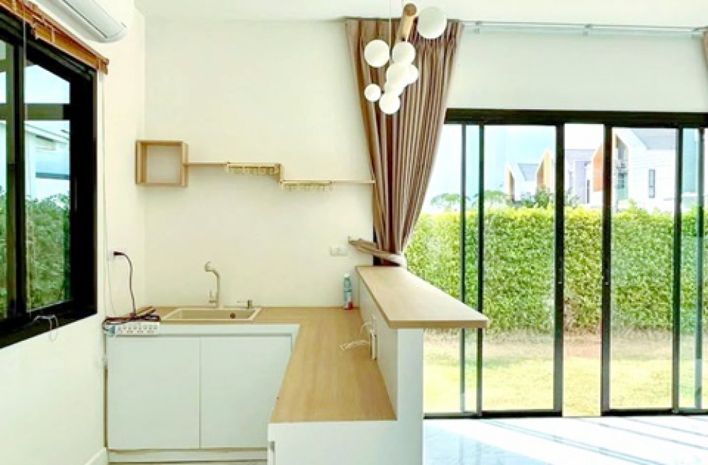 ลงเสาเข็มไมโครไพร์ มีสนามหญ้าและต้นไม้รอบบ้าน เคาน์เตอร์ครัว