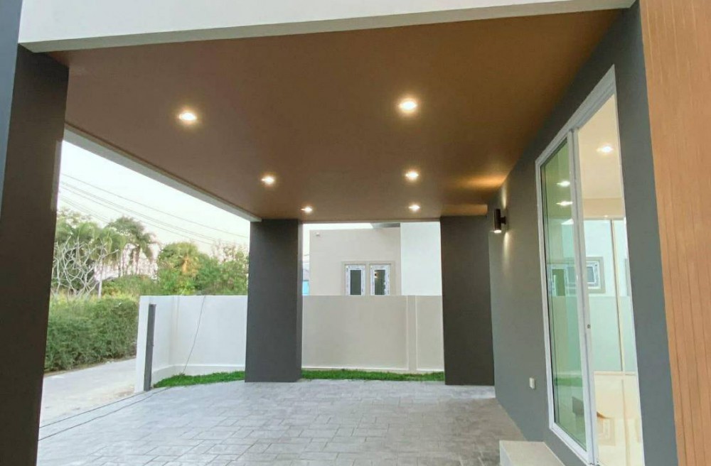 - พร้อมโรงจอดรถ จอดได้ 2-3 คัน กว้าง 7 ม. พื้นคอนกรีตพิมพ์ลาย